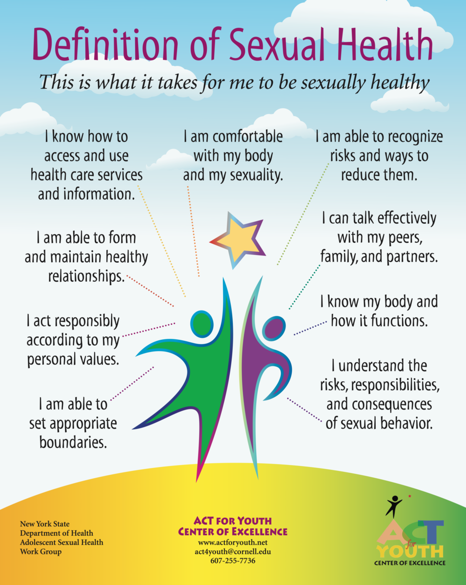 "A sexually healthy adolescent is able to realize his/her individual potential around critical developmental tasks related to sexuality. These tasks include: accepting his/her body, gender identity and sexual orientation; communicating effectively with family, peers and partners; possessing accurate knowledge of human anatomy and physiology; understanding the risks, responsibilities, outcomes and impacts of sexual actions; possessing the skills needed to take action to reduce his/her risk; knowing how to use and access the health care system and other community institutions to seek information and services as needed; setting appropriate sexual boundaries; acting responsibly according to his/her personal values; and forming and maintaining meaningful, healthy relationships" [1].