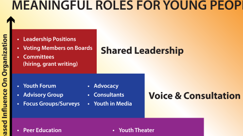 - Promote youth engagement and voice: We work with young people, not for them. We prepare ourselves and other adults for authentic youth engagement and shared decision-making. We listen to young people's expertise and perspectives, engage them in meaningful roles of their choosing, and create effective youth-adult partnerships. We foster mutual accountability.
